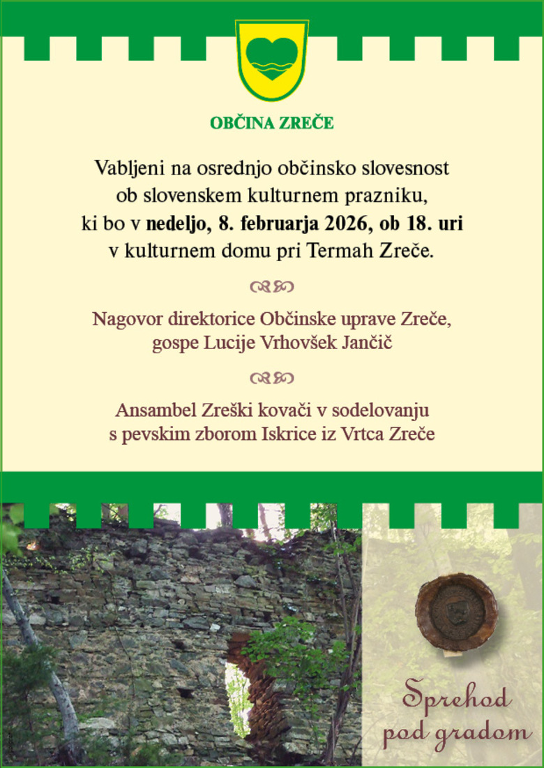 Vabljeni na osrednjo občinsko slovesnost ob slovenskem kulturnem prazniku, ki bo v nedeljo, 8.2.2026 ob 18. uri v kulturnem domu pri Termah Zreče.